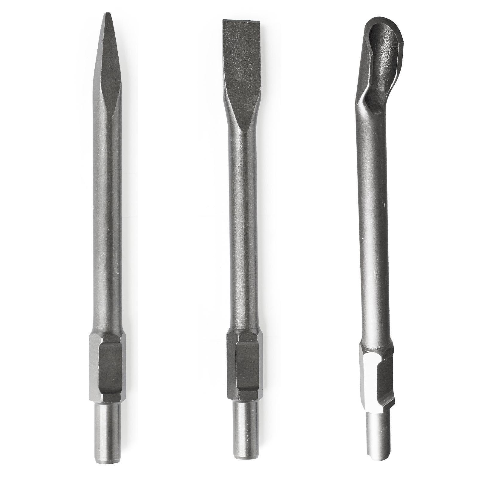 Der Meißel lässt sich mit einem Handgriff wechseln. Im Lieferumfang sind zwei Meißel (1x Spitzmeißel und 1x Flachmeißel) aus hochwertigem Stahl enthalten.