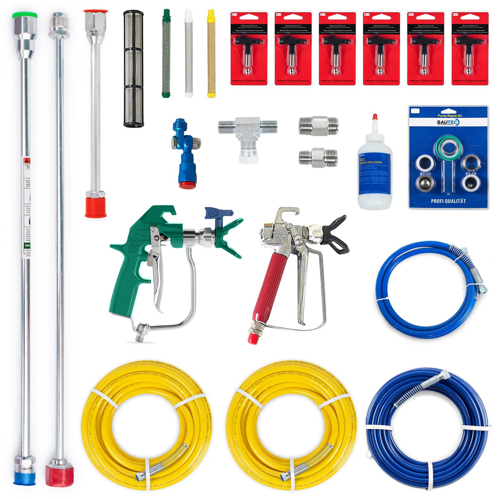 Das Gerät ist mit handelsüblichen Düsen, Schläuchen und Spritzpistolen kompatibel. In diesem Angebot ist bereits umfangreiches Zubehör für vielfältige Anwendungen dabei. Eine der Spritzpistolen ist für die Verarbeitung von Airless-Spritzspachtel optimiert.