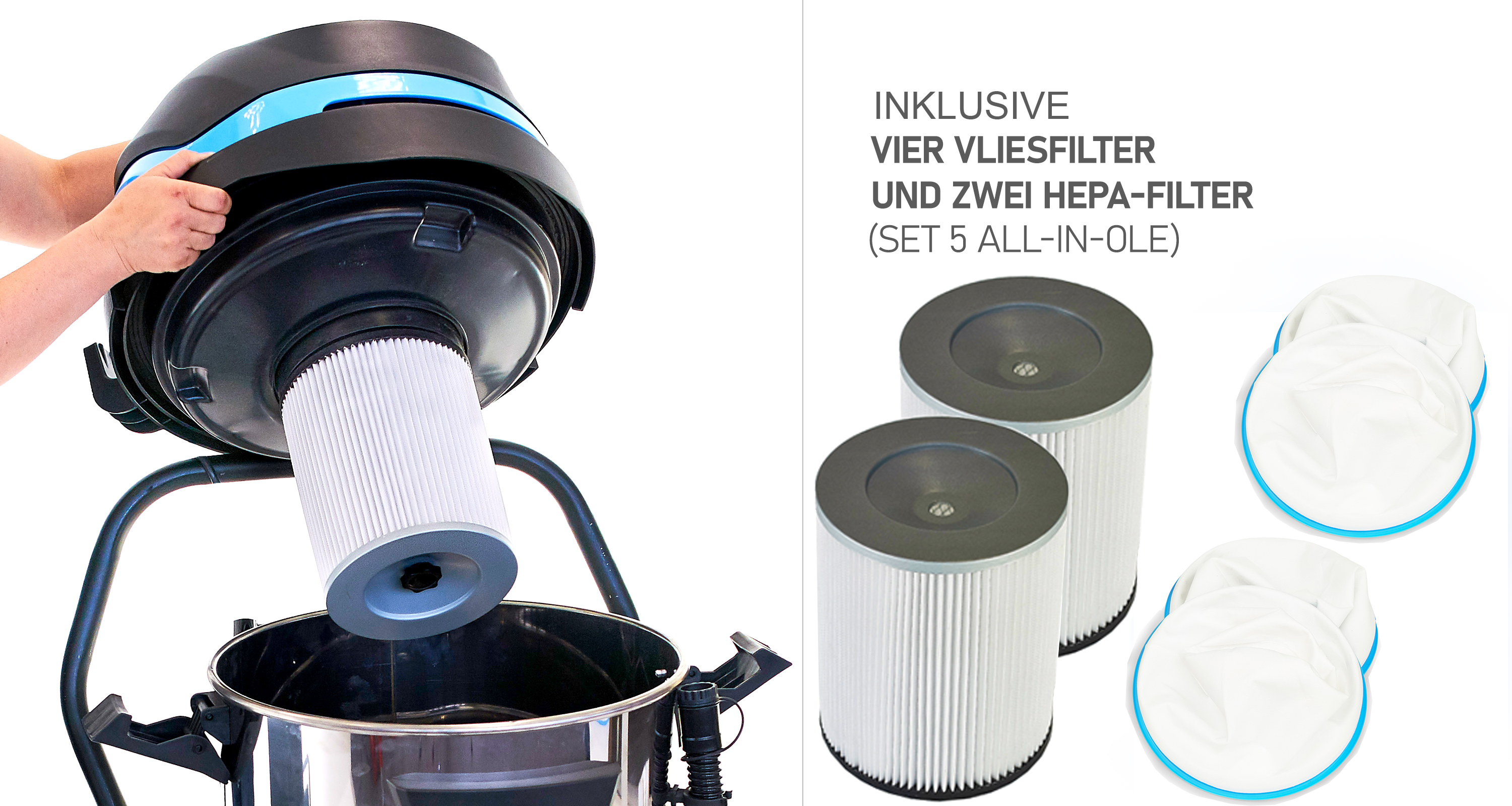 • 1x Zubehörset mit Rohr, Düsen und Filtern (2x Vlies-Filter & 1x HEPA-Filter)