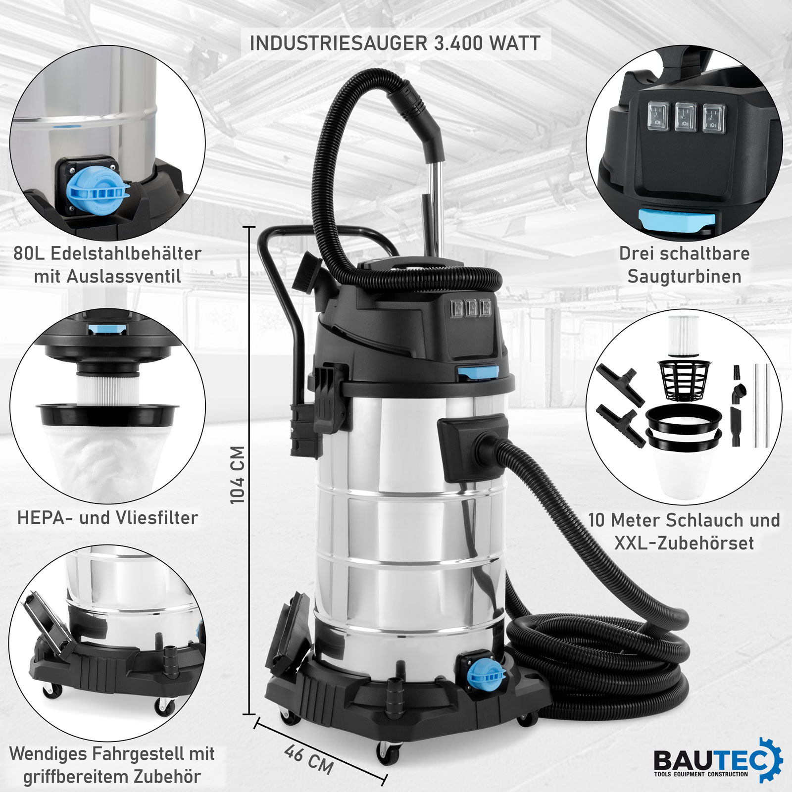 Der BAUTEC Industriestaubsauger überzeugt mit seiner kraftvollen Saugleistung und dem großen Volumen sowohl im mobilen als auch im stationären Einsatz. Der große Aktionsradius und die Lenkrollen sorgen dabei für hohe Flexibilität. Dank intelligenter Lösungen kann das komplette Zubehör direkt am Industriesauger mitgeführt werden. Mit dem Ventil lässt sich das Sauggut schnell und sicher entleeren. Das Profi-Set beinhaltet HEPA und auswaschbare Vlies-Filter für vielseitige Anwendungen.